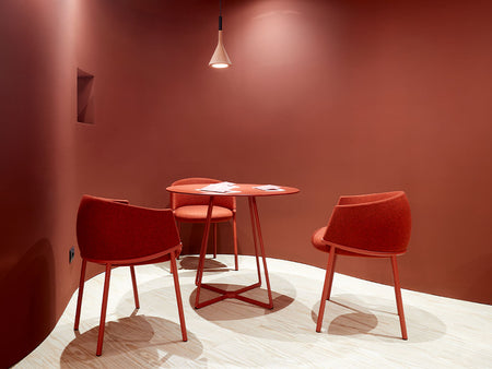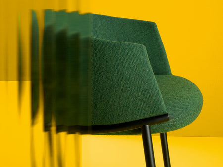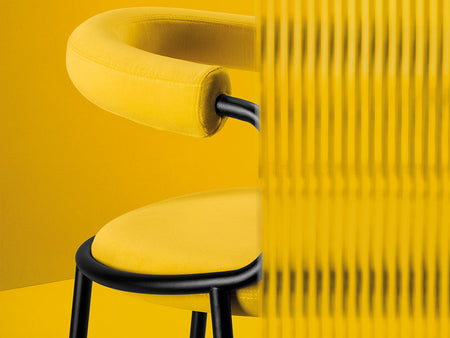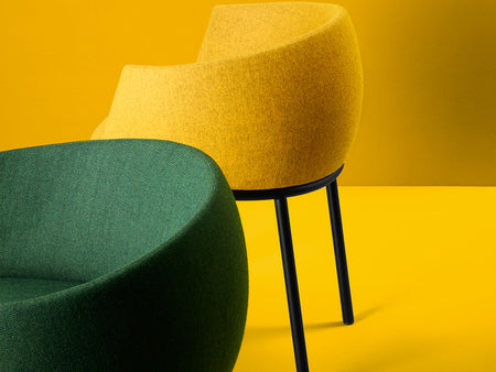 Available in two refined versions, the chair either features a padded tub‑style backrest for a softer, more sumptuous look or comes with a minimal tubular frame padded backrest for a graphic, informal effect. This versatility allows the design to respond beautifully to both refined residential and dynamic public space settings.