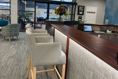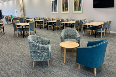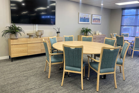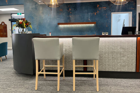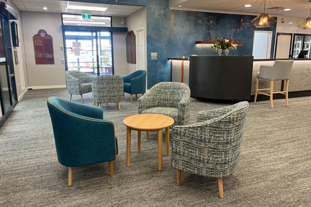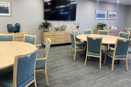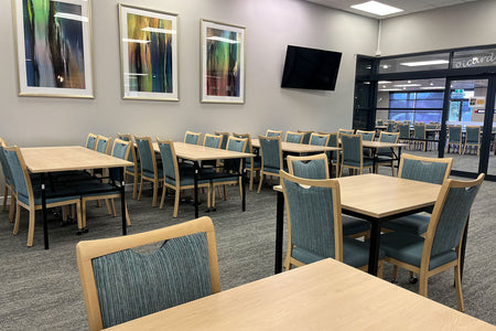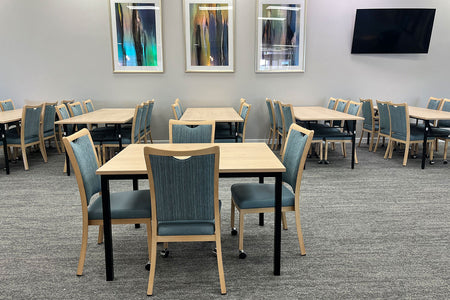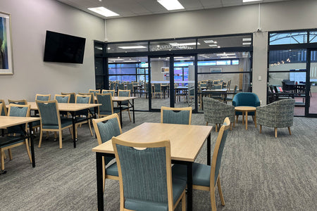 Furniture Options was contact for the refurbishment of the communal club and function rooms. Functional folding tables with custom laminate tops were used, with Hayley Side and Armchairs customised with handgrips and front castors. The bar also received an upgrade with Arcade Stools with Arms and the team from Painted Earth creating a beautiful feature wall.