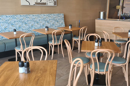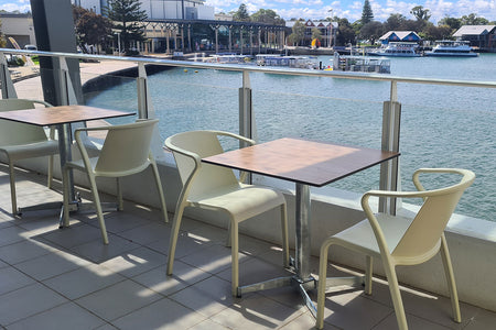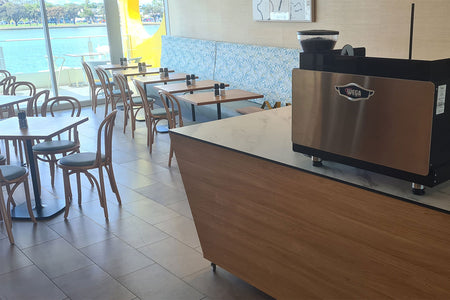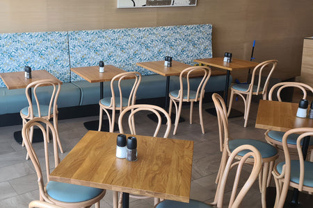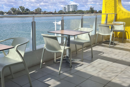 A recent café refresh for The Sebel Mandurah featuring a new custom made Mobile Coffee Station, Solid Oak Timber Tops, Ebony Bentwood Chairs and a custom made Nevada Banquette. On the balcony guests can relax and enjoy the view with the Fado Armchairs. No coffee will be split here as we selected the Parkway NOROCK Bases with Compact Laminate Tops.