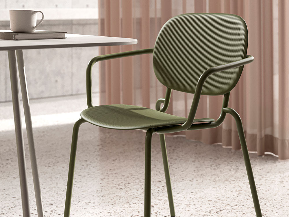 Crafted from certified regenerated plastic set upon a slender tubular metal frame, the Si‑Si Vibes forms part of S•CAB’s environmentally conscious Go Green collection. A particularly thoughtful detail is the bayonet‑lock attachment between backrest and frame, which ensures consistent thickness and prevents stress or tearing, underscoring the design’s functional resilience as well as its aesthetic sophistication.